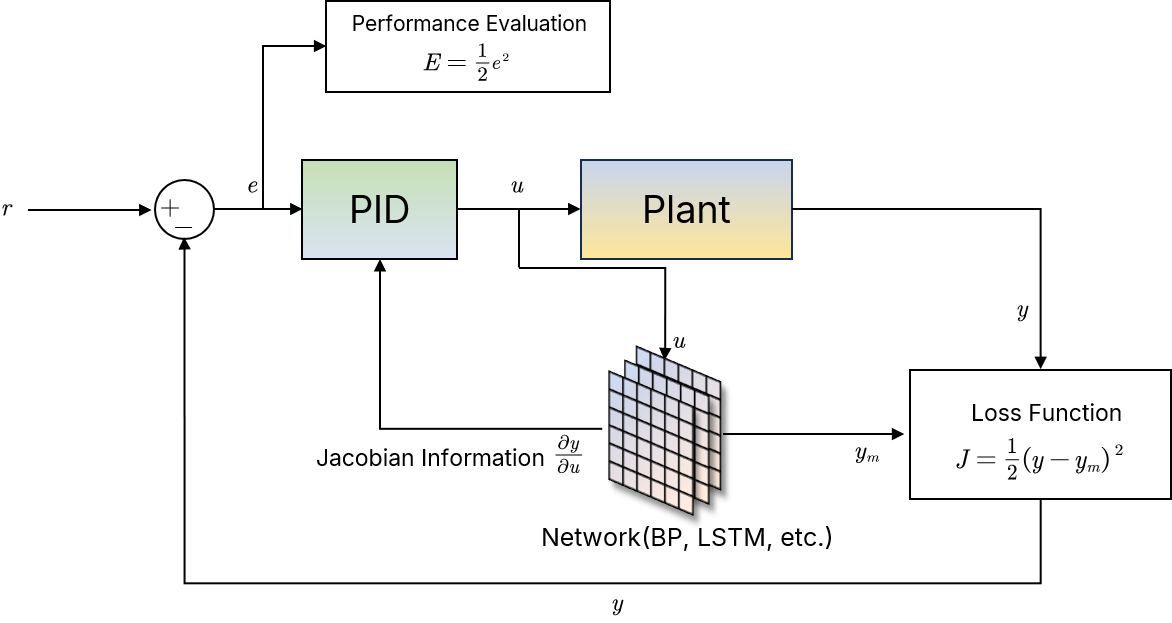 随后定义针对控制器表现的评估函数 \(E=\frac{1}{2}(r-y)^2=\frac{1}{2}e^2\) ,这和目前我们做的工作的理论是一致的——在我们目前的理论中,更新 PID 参数依靠的就是函数 \(E\),需要解决 \(\frac{\partial{E}}{\partial{K_p}}\) 链式求导中出现的未知量 \(\frac{dy}{du}\),因为 \(K_p\) 等 PID 参数就是神经网络给出的,随即可以进一步得到 \(E\) 对神经网络参数的梯度,因为 \(E\) 与神经网络输出不存在直接的关系,因此在得到 \(E\) 对神经网络参数的梯度后必须手动对网络参数进行更新,是非常麻烦的。